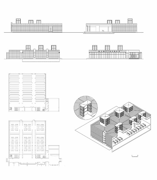 Es la ampliación de los módulos ubicados en la antigua iglesia del Gil de Albarnoz. Un vestíbulo da acceso al conjunto y a esta zona de ampliación con una planta sótano para depósito de libros y la planta superior como sala de lectura y trabajo.