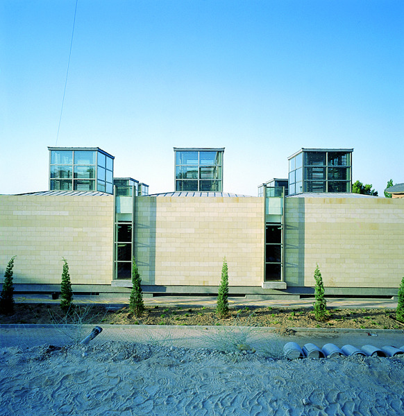 Volúmenes de gran sencillez revestidos de piedra caliza de color crema en todo el volumen construido.