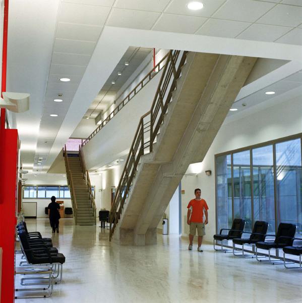 Un eje central donde se sitúa una doble escalera lineal deja patios interiores en torno a los cuales se organizan laboratorios y espcios de trabajo.