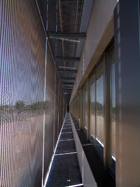 En una de las fachadas la malla metálica que cubre el frente tamiza la entrada de la luz y la visión desde el exterior. La otra fachada con un doble acristalamiento ofrece la imagen del vidrio como superficie uniforme y continua. Los laterales se revisten de piedra de color negro. Los núcleos de escaleras marcan el ritmo de acceso y núcleos de servicios.