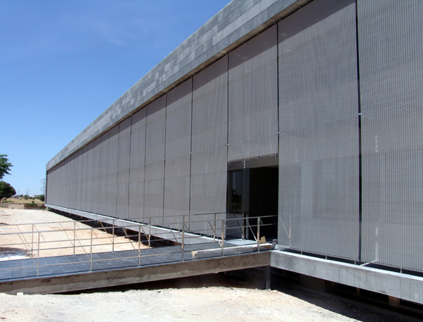 En una de las fachadas la malla metálica que cubre el frente tamiza la entrada de la luz y la visión desde el exterior. La otra fachada con un doble acristalamiento ofrece la imagen del vidrio como superficie uniforme y continua. Los laterales se revisten de piedra de color negro. Los núcleos de escaleras marcan el ritmo de acceso y núcleos de servicios.