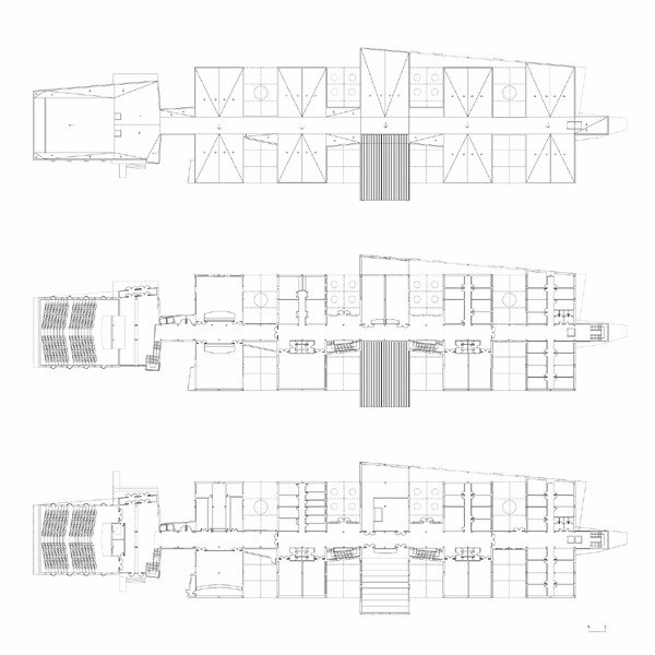 Las dos plantas del edificio en esta zona se interrumpen ocasionalmente con espacios de una sola altura creando así un juego de volúmenes sugerente en el recorrido lineal de su volumen general.