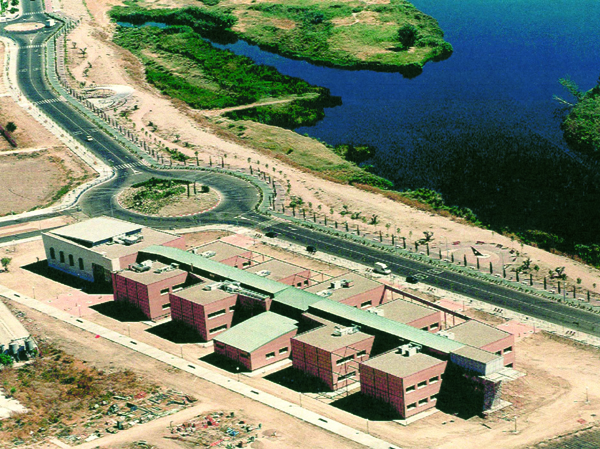 Edificio de la Universidad de Castilla-La Mancha en una zona del borde de la ciudad cercana al río Tajo. Una estructura lineal de 6.000 metros cuadrados con aulas, seminarios, laboratorios y zona departamental.