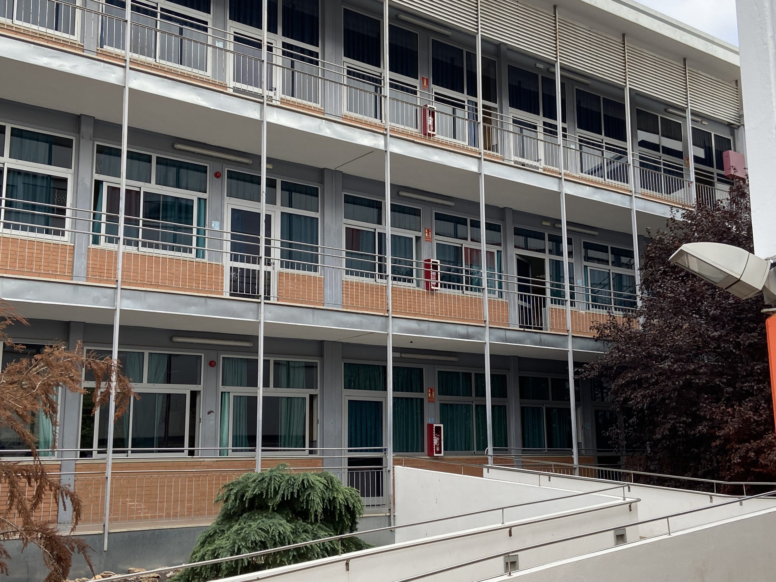 En Ciudad Real su propuesta es de la máxima radicalidad con un pabellón de planta rectangular que agrupa las aulas en línea con una fachada posterior y otra delantera por donde se realiza el acceso. Dos escaleras en sus puntos extremos dan acceso a la galería que recorre el conjunto del edificio y por la que se accede a las diferentes aulas. En tres alturas resuelve un programa amplio de numerosas aulas que, en el momento de su construcción, venían a completar las necesidades del colegio que todavía ocupaba una parte del edificio histórico del antiguo asilo. Las galerías protegidas por barandilla metálicas ligeras van dejando ver la fachada de las aulas con los accesos a cada una de ellas. Una geometría radical que encuentra su valor precisamente en la sobriedad de la solución y en la racionalidad de todos sus elementos.