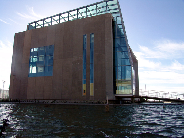El acceso se realiza por uno de sus extremos donde se localiza la escalera que se cierra exteriormente con un volumen acristalado de forma irregular que sobresale del conjunto construido.