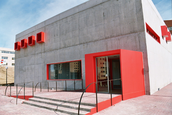 Un volumen de hormigón visto del que destacan las ventanas y puntos de acceso con los cu8erpos salientes en color rojo.