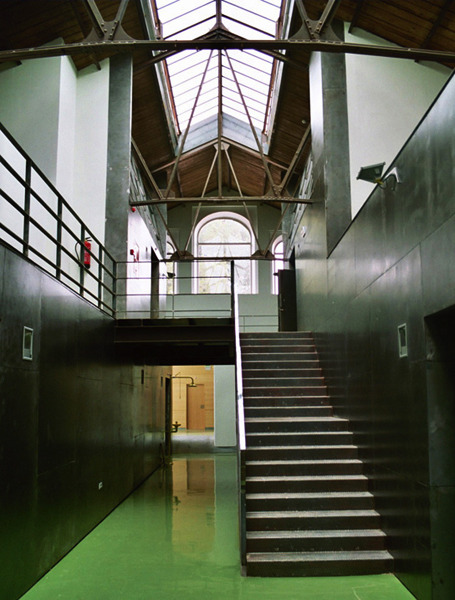 Galería inferior de acceso a laboratorios. Doble escalera de acceso a planta superior.