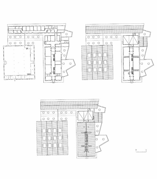Un volumen principal de planta rectangular y estructura de cubierta de madera que define la entrada de Carlos III al conjunto (Museo de arma blanca). Esta zona se ha rehabilitado como espacio de pequeños despachos y laboratorios.