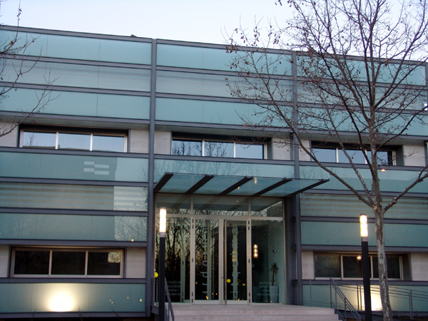 El acceso central, subrayado por una marquesina que vuela sobre los escalones de acceso diferencia, en planta baja, la zona de laboratorios de los servicios de administrción y empresas de la parte derecha.