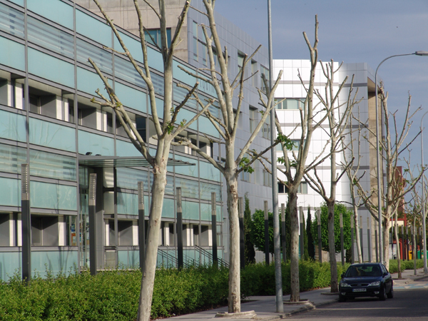 El acceso central, subrayado por una marquesina que vuela sobre los escalones de acceso diferencia, en planta baja, la zona de laboratorios de los servicios de administrción y empresas de la parte derecha.