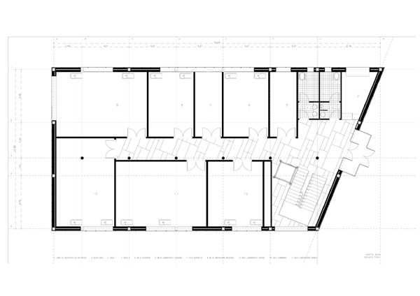 En la entrada al recinto dos volúmenes uno de ellos laboratorios de investigación y el otro con zonas administrativas, salón de actos y espacios para actividades divulgativas.
